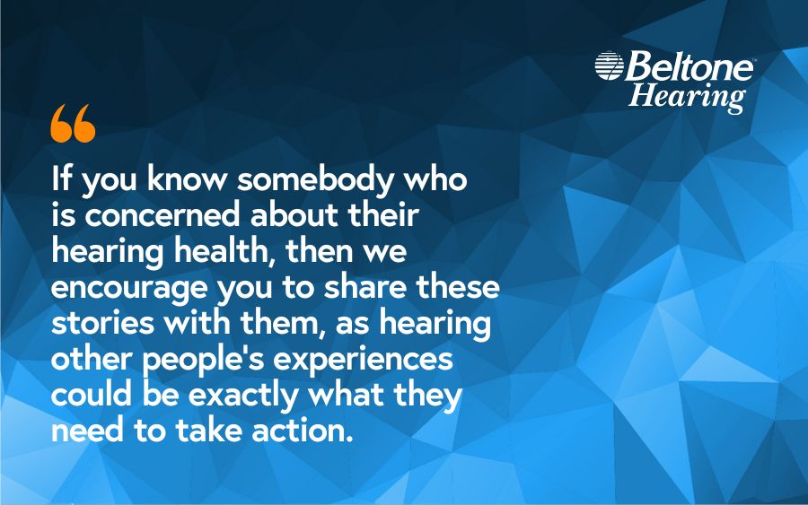On average, people take up to seven years from the first realization of their hearing loss to finally seek treatment. Throughout our years of experience, we’ve noticed that two of the main hurdles for many people are the uncertainty of what to expect and financial concerns. We've seen that the earlier someone can address their hearing health concerns, the better their quality of life will be. So if you know somebody who is concerned about their hearing health, then we encourage you to share these stories with them, as hearing other people’s experiences could be exactly what they need to take action. [/et_pb_text]Our team at Beltone is always ready to answer any questions you may have. Please call us at (888) 691-3821. Let us help you on your journey to better hearing health.